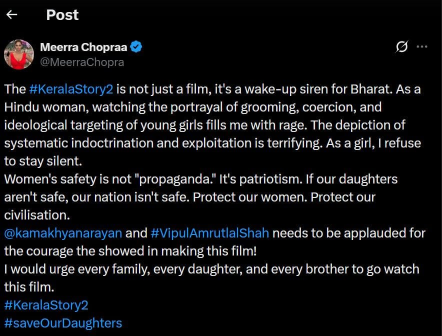 फिल्म ‘द केरल स्टोरी 2’ कल शुक्रवार को रिलीज हो गई है। एक तरफ इस फिल्म को लेकर विवाद है। कुछ लोग इसे ‘प्रोपोगेंडा’ फिल्म कहकर आलोचना कर रहे हैं। मगर, वहीं, फिल्म जब थिएटर्स में लग गई है तो इसे सकारात्मक प्रतिक्रिया भी मिल रही हैं। साउथ की चर्चित अभिनेत्री मीरा चोपड़ा ने इस फिल्म को देखने के बाद अपने विचार साझा किए हैं।