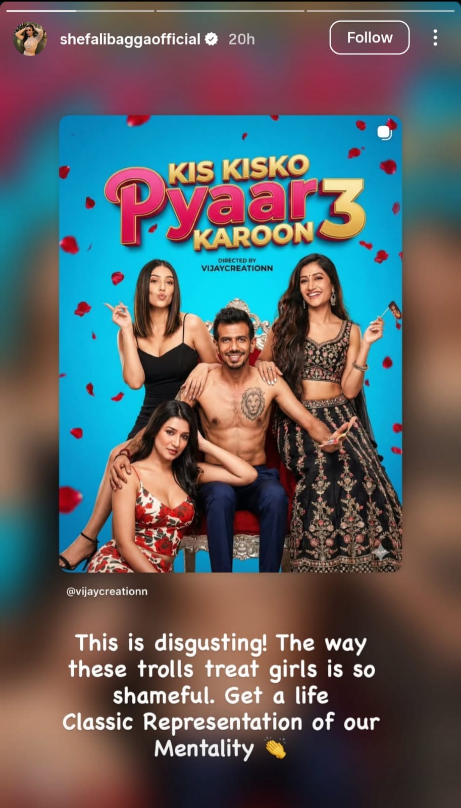 शेफाली ने जब चहल के साथ अपनी, आरजे महवश और धनश्री वाली एआई फोटो देखी तो वह आग-बबूला हो गईं। उन्होंने अपने इंस्टाग्राम पेज के स्टोरी सेक्शन वह तस्वीर शेयर की और लिखा, ‘यह बहुत घटिया है। जिस तरह से ये ट्रोल लड़कियों के साथ बर्ताव करते हैं, वह बहुत शर्मनाक है। अपनी जिंदगी जियो। यह आपकी खराब मानसिकता का उदाहरण है।’ इस पोस्ट पर आरजे महवश और चहल की पूर्व पत्नी धनश्री ने अब तक कोई रिएक्शन नहीं दिया है।