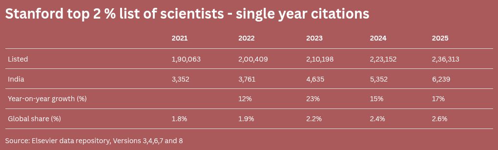 The list is built by a team of researchers at Stanford University, led by Professor John P.A. Ioannidis, using Elsevier’s Scopus database, considered to be the world’s largest indexed global citation database. Out of an estimated 109 lakh scientific authors in the world, the list for 2025 includes about 2.2% of the highly cited researchers during 2024, working out to some 2,36,313 scientists, who are classified into five domains: Applied Sciences, Arts and Humanities, Economic and Social Sciences, Health Sciences, and Natural Sciences, further segregated into 22 primary scientific fields and 174 sub-fields.